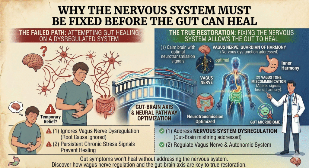 The prevailing myth that gut health can be restored independently without addressing nervous system dysregulation is flawed. For decades, patients have been led to believe that dietary changes alone can heal their gut issues. They can’t. When the nervous system particularly the vagus nerve is disregarded, true healing is impossible. This is the crux of gut and nervous system interplay.