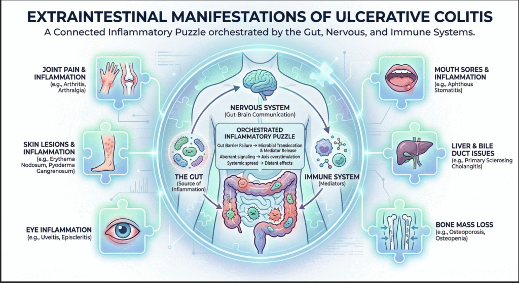 Extraintestinal manifestations of ulcerative colitis are not enigmatic clusters of unrelated symptoms. They are connected pieces of an inflammatory puzzle orchestrated by the gut’s delicate interplay with the nervous and immune systems.