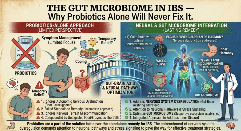 Probiotics are a part of the solution but never the standalone remedy for IBS. The entrenchment of nervous system dysregulation demands attention to neuronal pathways and stress signaling to pave the way for effective treatment strategies. This multifactorial perspective offers the clinical precision necessary for navigating the complexities of IBS beyond simplistic remedy myths.