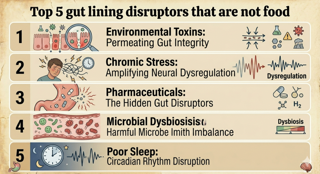 The gut lining does not stand alone as a passive barrier. Non-food lifestyle and environmental factors engage vigorously in its disruption. Clinical truth demands: examine beyond the plate.