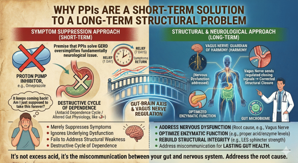 The premise that PPIs solve acid reflux oversimplifies a fundamentally neurological issue. The clinical path acknowledges that lasting gut health requires addressing nervous and enzymatic dysfunction rather than merely suppressing symptoms. It’s not excess acid it’s the miscommunication between your gut and nervous system.