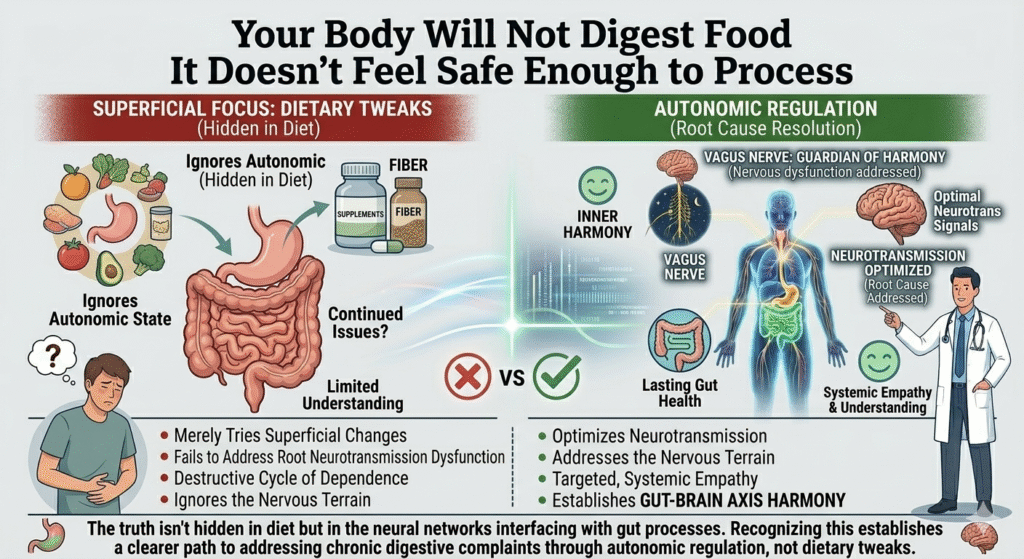 Without robust nerve signaling and a regulated autonomic state, digestion will not proceed efficiently. The truth isn’t hidden in diet but in the neural networks interfacing with gut processes. Recognizing this establishes a clearer path to addressing chronic digestive complaints through autonomic regulation, not dietary tweaks.