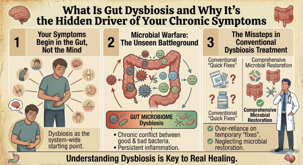 Your symptoms are not a standalone saga but chapters of a larger narrative called gut dysbiosis. They do not lie in isolation; they are intricately woven into the physiological fabric of your gut health. The next time you discuss your symptoms, remember to name this forgotten driver: dysbiosis. It’s not an alternative theory; it’s a clinical cornerstone ignored at the peril of genuine recovery.